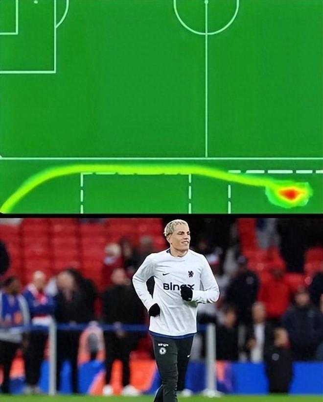 赛后,网络上迅速掀起了一波对加纳乔的调侃热潮。一张“热图”疯传:图中,他的活动区域只有一个鲜红的热点,紧贴边线——那不是他在场上奔跑的轨迹,而是他在场边热身的“证据”。这张图配上一句“Touchline winger”(边线边锋),瞬间引爆评论区。