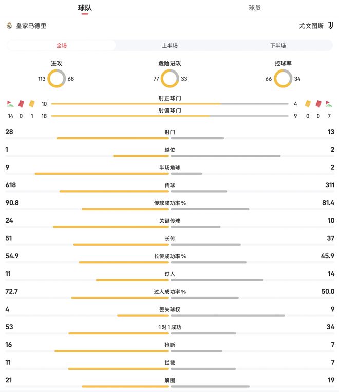 皇马vs尤文图斯全场数据:射门28-13,控球率66%-34%